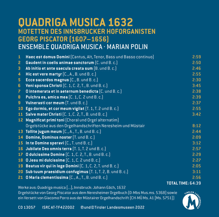 Im Mittelpunkt dieser Einspielung stehen Motetten des Innsbrucker Hoforganisten Georg Piscator (Fischer), eines großen Unbekannten der glanzvollen Innsbrucker Musikgeschichte des 17. Jahrhunderts. Ein einziges vollständiges Exemplar seiner 1632 bei Johann Gäch in Innsbruck veröffentlichten Sammlung „Quadriga musica“ ist in der Proske-Bibliothek in Regensburg erhalten geblieben, ansonsten nur ein einzelnes Stimmbuch in der Bayerischen Staatsbibliothek München. Piscator wurde von seinem Dienstherrn Erzherzog Leopold V. von Österreich-Tirol nach Venedig geschickt, um den aktuellsten italienischen Stil zu erlernen und nach Innsbruck zu bringen. Diesen Stil vertritt Piscator in seinen Motetten, wobei bei ihm eine Orientierung am Madrigal feststellbar ist; der Innsbrucker Hoforganist versteht es, einprägsame Kopfmotive zu finden und für maximale Abwechslung zu sorgen, indem er die Stimmen geschickt kombiniert und dramatisch wirksame Spannungsbögen gestaltet. Die vokale Virtuosität kommt vor allem in den Solomotetten zum Tragen. Die Motetten der „Quadriga musica“ sind echte Entdeckungen, zugleich Paradebeispiele für die italienisch geprägte Musica sacra am dezidiert italophilen, am Glanz florentinischer Hofhaltung orientierten Hof von Leopold V. und Claudia de’ Medici, die nach dem Tod ihres Gatten an Stelle ihres unmündigen Sohnes Ferdinand Karl die Regentschaft übernahm. Leopold starb bereits 1632, im Erscheinungsjahr von Piscators „Quadriga musica“. Piscator wurde drei Jahre später zum Hoforganisten in München berufen und ging dann nach Wien, wo er als Organist und Regens chori im Schottenkloster wirkte. Er starb dort im Jahr 1656.