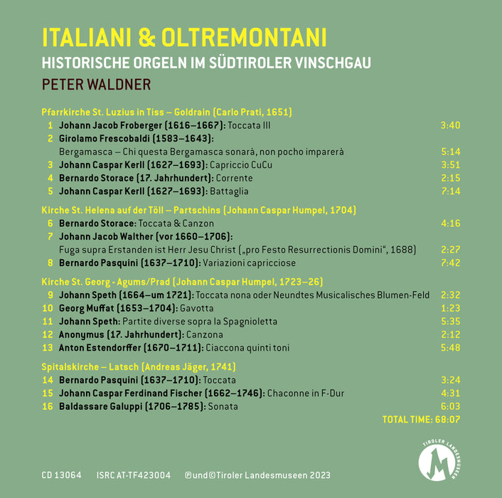 Der Südtiroler Vinschgau war seit jeher ein Kulturraum am Kreuzungspunkt zwischen Nord und Süd. Durch das obere Etschtal verläuft einer der großen Handelswege zwischen dem deutschen und dem italienischen Sprachraum. Auch die Orgellandschaft ist vom Zusammentreffen italienischer und süddeutscher Einflüsse geprägt. Der aus dieser Region stammende, mit den lokalen Instrumenten bestens vertraute Organist Peter Waldner präsentiert vier faszinierende historische Orgeln des 17. und 18. Jahrhunderts: Der renommierte Meister Carlo Prati aus Trient zeichnete im Vinschgau für eine Reihe von Orgelneubauten verantwortlich. Zwei Instrumente von Johann Caspar Humpel aus dem frühen 18. Jahrhundert zeigen exemplarisch, wie Tiroler Orgelbauer – Humpel wurde in Innsbruck ausgebildet und ließ sich in Meran nieder – sehr italienisch bauten. Zu den süddeutschen Orgelbauern, die in Tirol sehr geschätzt wurden, gehört Andreas Jäger aus Füssen. Auf den Instrumenten von Prati, Humpel und Jäger erklingt u.a. Musik von Frescobaldi, Froberger und Kerll. Diese musikalischen Autoritäten waren im gesamten süddeutsch-österreichischen Raum lange tonangebend.
